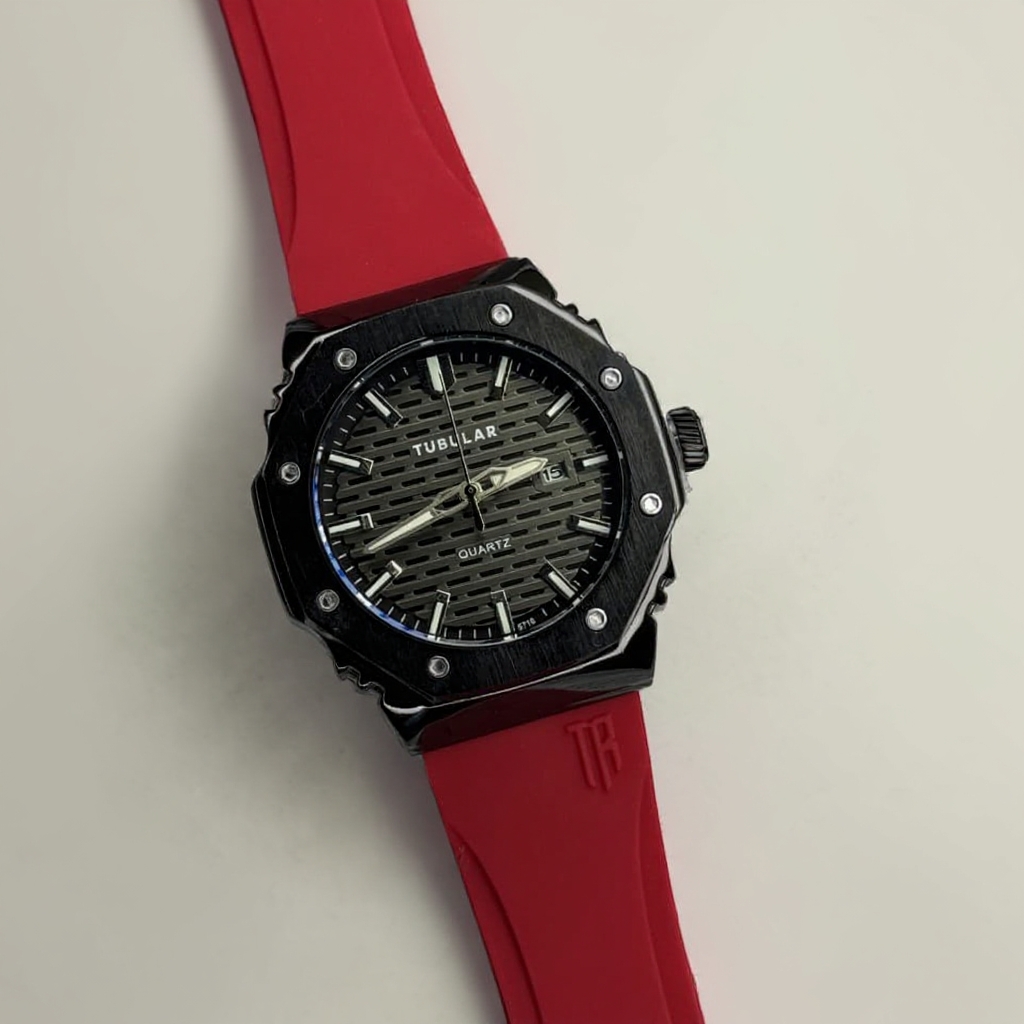 Sporty Quartz Rubber Strap Watch – Black & Red Edition